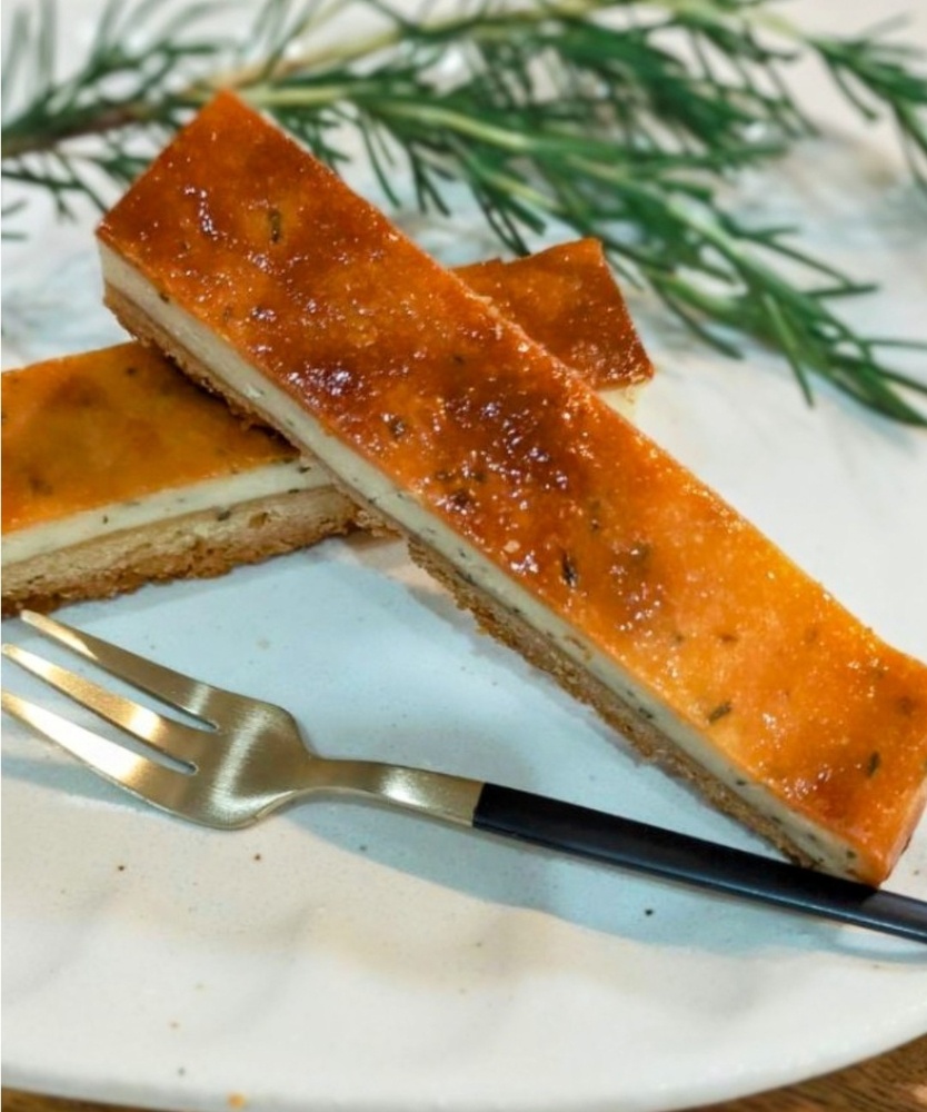 五感を刺激するテクスチャ: サクサクとしたタルト台、しっとりと密度の高いチーズ、そして時折顔を出すローズマリーの微かな歯触り。
