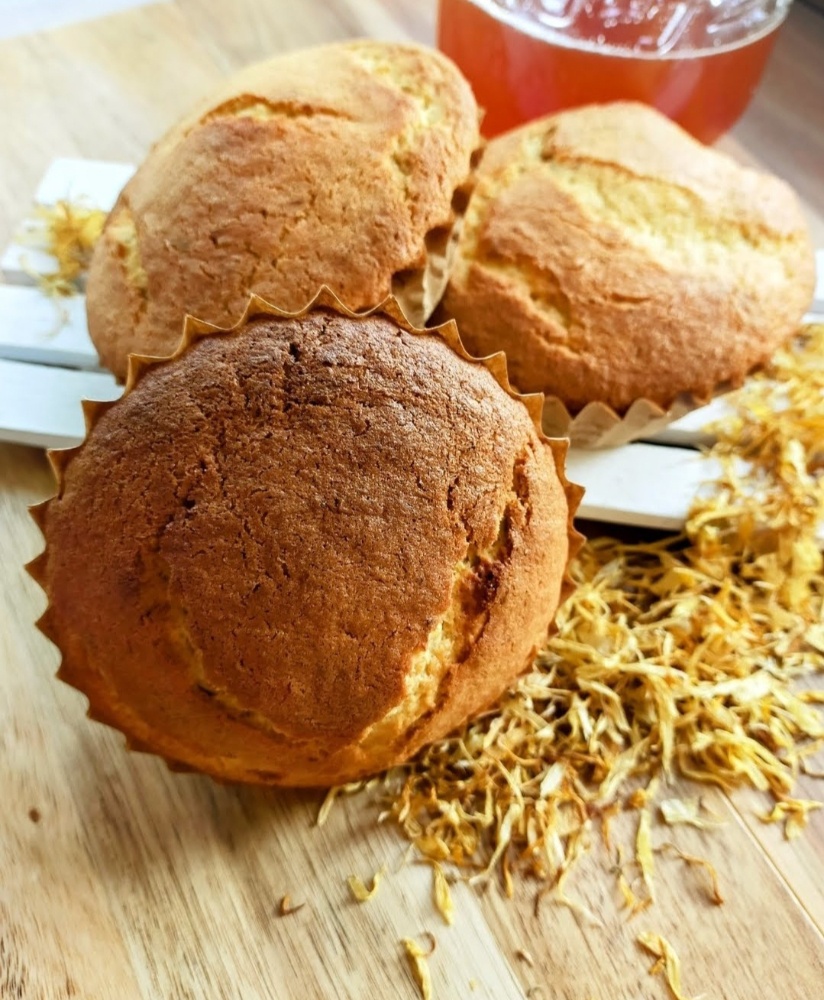 ふっくらと焼き上がったマフィンから漂う、どこか懐かしく温かな香り。カレンデュラのマフィンは、まるでお皿の上に小さな太陽がのっているかのような、心穏やかになれる存在です。ドライカレンデュラを細かくミルして生地に混ぜ込むことで、お菓子全体が淡い黄金色に染まり、目にするだけでも元気が湧いてくるような気がいたします。