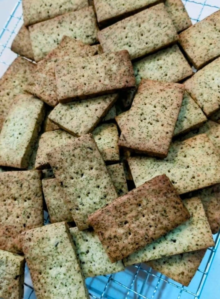 オーブンから取り出した瞬間に広がるのは、ローズマリーの爽快で力強い香りです。そこにミルで細かくした緑茶の香ばしさが加わることで、香りの立ち方に奥行きが生まれます。ひと口齧れば、クラッカー特有の軽やかな食感とともに、茶葉のわずかな苦味とハーブの清涼感が口いっぱいに広がっていくのがわかります。